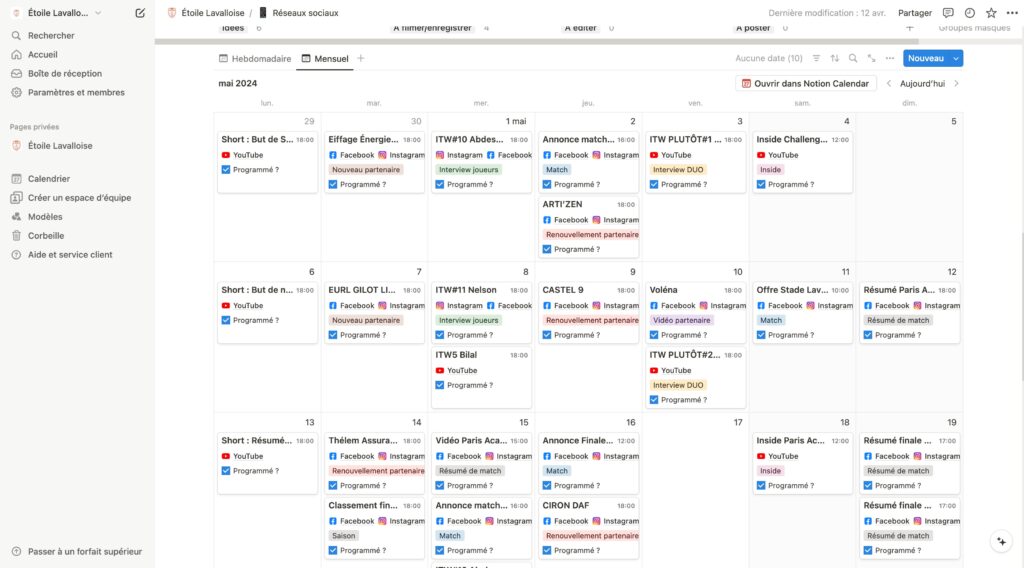 J’ai développé et gère le calendrier éditorial de l’Étoile Lavalloise à l’aide de l’outil Notion. Ce calendrier constitue un pilier essentiel de notre stratégie de contenu, permettant une planification efficace et une coordination optimale de nos publications sur les réseaux sociaux.